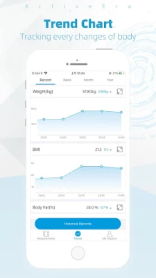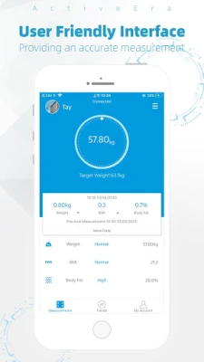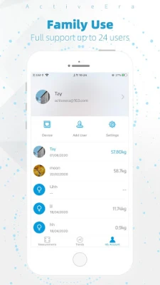 Active Era synchronisiert sich mit Ihren Active Era Smart Scales. Erfassen Sie Ihre Körperzusammensetzung umfassend, von Gewicht bis Körperfett. Verfolgen Sie Fortschritte mit Diagrammen, teilen Sie Daten und nutzen Sie bis zu 24 Profile. Kompatibel mit Google Fit und Fitbit.