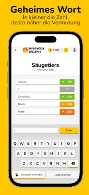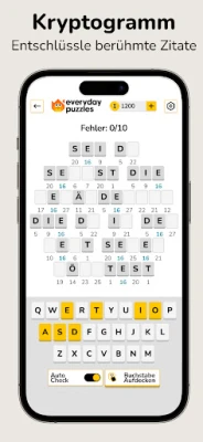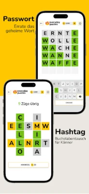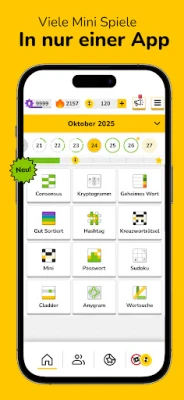 Die Palette der verfügbaren Spiele in Everyday Puzzles ist beeindruckend vielseitig. Stellen Sie sich der Meinung der Masse in CONSENSUS, wo Sie versuchen, die beliebtesten Antworten der Community zu erraten. Entschlüsseln Sie bedeutungsvolle Zitate in KRYPTOGRAMM oder finden Sie das versteckte Wort mit farbcodierten Hinweisen in GEHEIMES WORT. Fans von Waffle werden HASHTAG lieben, während PASSWORT eine tägliche Dosis kniffliger Wortdeduktion im Stil von Wordle bietet. Natürlich dürfen die beliebten WORTSUCHE und herausfordernde SUDOKU-Rätsel nicht fehlen, ebenso wenig wie die klassischen KREUZWORTRÄTSEL. Mit GUT SORTIERT fordern Sie Ihre Assoziationsfähigkeit heraus, und CLADDER testet Ihre Geschwindigkeit beim Lösen von Wortleitern. Diese sorgfältig kuratierte Auswahl garantiert, dass keine Langeweile aufkommt.