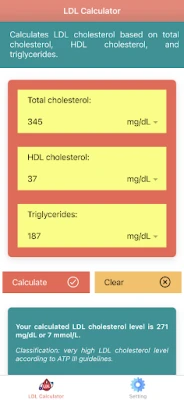 **LDL Cholesterol Calculator - Cholesterol Tracker** setzt auf wissenschaftliche Präzision: Die Berechnung erfolgt mittels der bewährten Friedewald-Formel, um Ihnen verlässliche Ergebnisse zu liefern. Darüber hinaus unterstützt die App die Ableitung empfohlener LDL-Werte auf Basis der ATP III-Leitlinien, sodass Sie Ihre persönlichen Zahlen im Kontext relevanter medizinischer Empfehlungen sehen können. Ob Sie Ihre Werte in mg/dL oder mmol/L bevorzugen, die App bietet die Flexibilität, zwischen beiden gängigen Maßeinheiten zu wechseln. Dies macht die Nutzung für ein breites Publikum zugänglich und komfortabel.