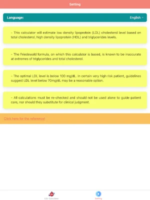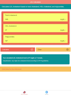 "LDL Cholesterol Calculator - Cholesterol Tracker" ist eine mobile App zur genauen Berechnung des LDL-Cholesterins mittels Friedewald-Formel. Sie benötigt Gesamtcholesterin, HDL-Cholesterin und Triglyceride. Die App ermittelt zudem den empfohlenen LDL-Spiegel gemäß den ATP III Richtlinien.